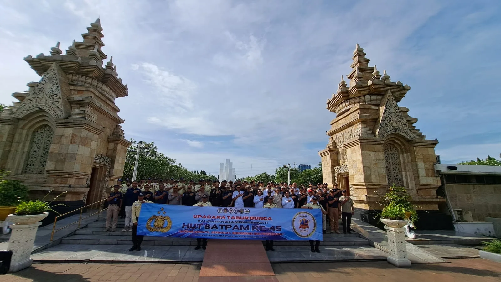 Sejak pagi, suasana TMP Kalibata tampak lebih ramai dari biasanya. Deretan satpam dengan seragam krem khas mereka memenuhi area taman makam, berdiri dengan rapi dan penuh khidmat mengikuti rangkaian acara. Nuansa pagi yang sejuk berpadu dengan suasana haru dan penghormatan, menciptakan momen yang sarat makna bagi seluruh peserta yang hadir.